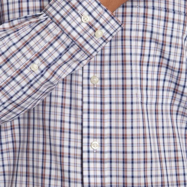 Color y diseño: Base blanca con patrón de cuadros en azul y marrón, elegante y atemporal.